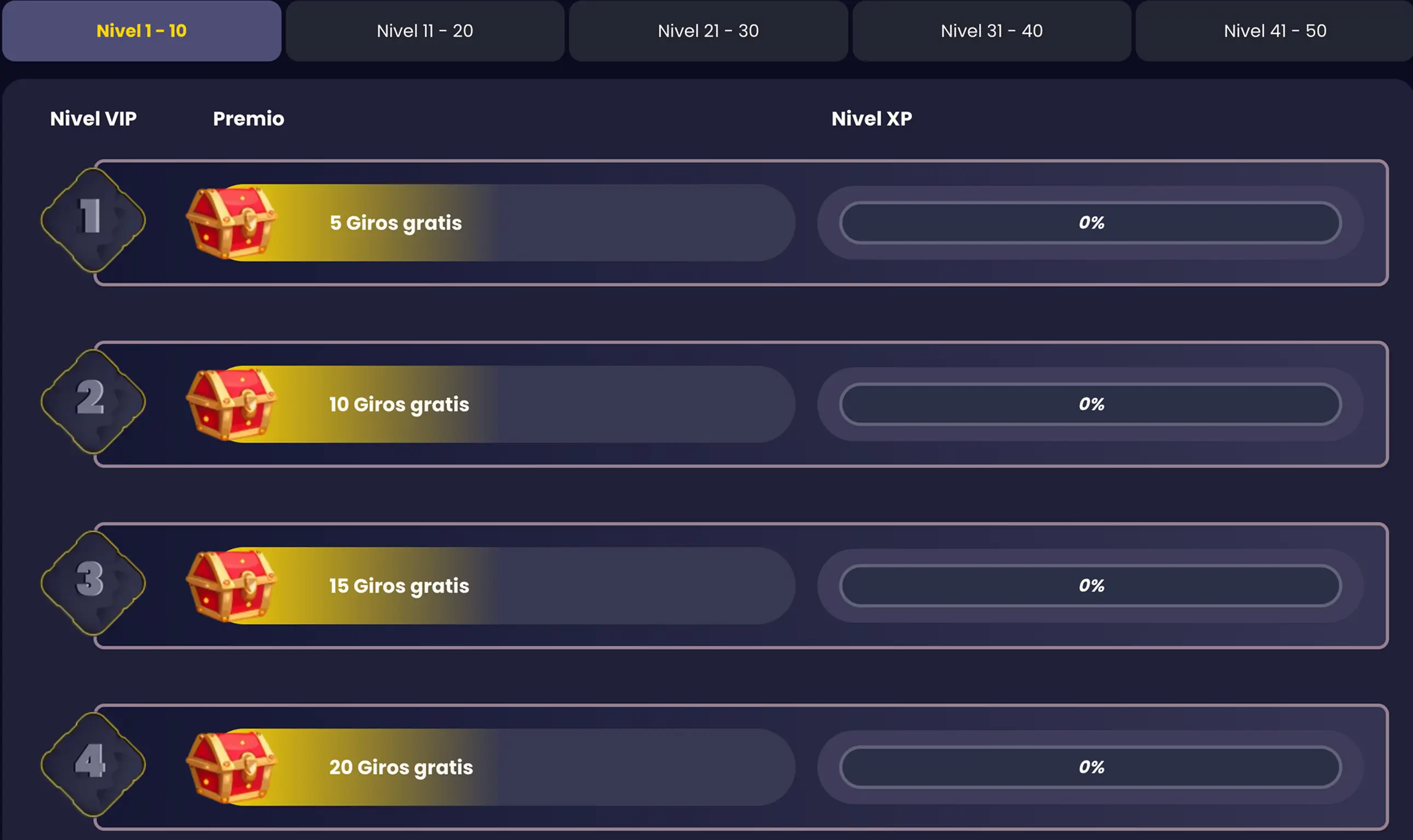 | Niveles VIP | 50 niveles con recompensas crecientes |